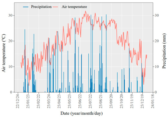 Daily variations in average air temperature (°C) and precipitation (mm) in a tea plantation under different fertilization strategies. The meteorological data were obtained using a WS-MC01 compact automatic weather station installed on-site.