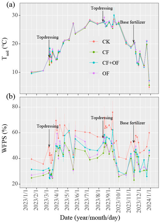 Seasonal variations in soil temperature (Tsoil; 10 cm depth) (a) and water-filled pore space (WFPS) (b) in a tea plantation under different fertilization strategies. Error bars represent the standard errors (n = 3). Vertical arrows indicate the timing of fertilizer application. CK, no N fertilizer application as control; CF, 100% chemical fertilizers; CF + OF, 60% chemical fertilizers + 40% organic fertilizer; OF, 100% organic fertilizer.