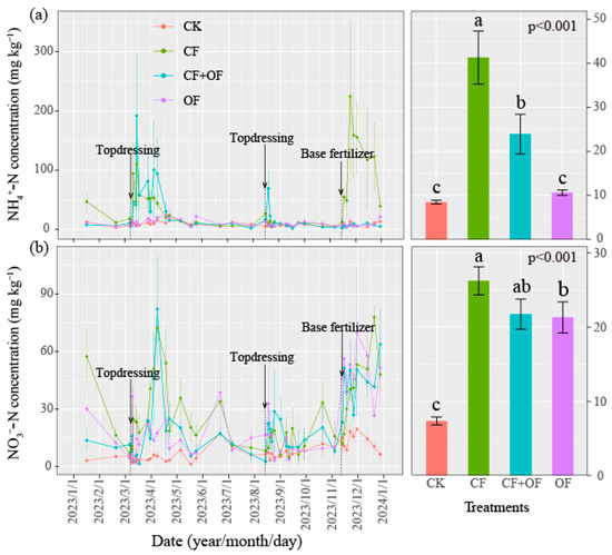 Further, the changes in inorganic N levels with time were analyzed. In the control (CK) plot, the inorganic N (NH4+-N and NO3−-N) showed less variation with season. The NH4+-N content during the experimental period ranged from 1.29 to 29.28 mg kg−1 (average = 8.48 mg kg−1), and the NO3−-N concentration ranged from 0.16 to 26.79 mg kg−1 (average = 7.36 mg kg−1) (Figure 4). On the contrary, the inorganic N concentration of the fertilized soil exhibited significant variation with season. Under the CF and CF + OM treatments, the content of NH4+-N in the 0–10 cm soil layer peaked on day 7 after spring tea topdressing (Figure 4a), while NO3−-N concentration peaked after 30 days (Figure 4). In the OF plot, NH4+-N and NO3−-N exhibited gradual changes with no distinct peaks after the treatment (Figure 4). After the autumn tea topdressing, NH4+-N concentration of the CF and CF + OF soil increased gradually and peaked at around day 2–4, while NO3−-N concentration peaked around day 10. However, no significant peak was observed in the NH4+-N and NO3−-N concentration after OF treatment. Following base fertilization in November, the maximum NH4+-N and NO3−-N levels in the CF-treated soil were detected on the 10th day and 38th day, respectively. During this stage, the content of NH4+-N in the 0–10 cm soil layer remained relatively stable under CF + OF and OF treatments, while NO3−-N remained high up to 50 days after fertilization.