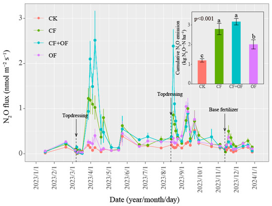 Variations in N2O flux and cumulative N2O emission from tea garden soil under different fertilization strategies. The insert panel displays the cumulative N2O emissions under different fertilization strategies. Error bars represent the standard errors (n = 3). The vertical arrows indicate the timing of fertilizer application. Lowercase letters above the bars in the graph indicate significant differences in the cumulative N2O emissions among the different fertilization strategies (Tukey’s post hoc test; p < 0.05). CK, no N fertilizer application as control; CF, 100% chemical fertilizers; CF + OF, 60% chemical fertilizers + 40% organic fertilizer; OF, 100% organic fertilizer.