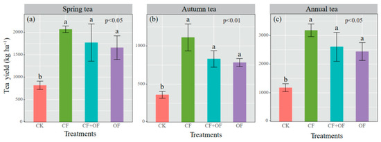 The changes in spring (a) and autumn (b) tea yield and annual tea yield (c) in a plantation under different fertilization strategies. Error bars represent the standard errors (n = 3). Lowercase letters above the bars indicate significant differences in yield among the different fertilization strategies based on Tukey’s post hoc test (p < 0.05). CK, no N fertilizer application as control; CF, 100% chemical fertilizers; CF + OF, 60% chemical fertilizers + 40% organic fertilizer; OF, 100% organic fertilizer.