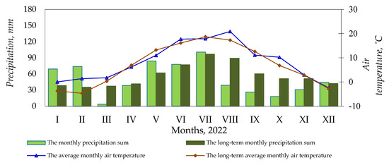 - (AB + H) biological preparations—nitrogen bacteria Paenibacillus polymyxa (1.0 L ha−1) and humic acids (15% suspension of humic and fulvic acids, pH 4–5; 1.0 kg ha−1) applied to the soil surface immediately after sowing in combination with KAS-32.