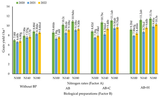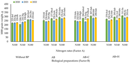 - (AB) biological preparation—nitrogen bacteria Paenibacillus polymyxa (1.0 L ha−1) applied to the soil surface immediately after sowing in combination with KAS-32,