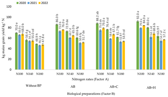 | y(2022)— kg maize grain kg−1 N | Without BP | y = 92.3 − 0.25x | −0.94 | 0.88 | p < 0.01 |