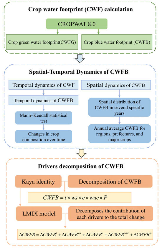 This study investigates the spatial–temporal dynamics of the crop water footprint in Xinjiang. In contrast to previous studies that primarily focus on total water footprint, this research places particular emphasis on blue water footprint, offering a more accurate assessment of agricultural water allocation and consumption in the region. The CROPWAT 8.0 model was utilized to calculate the crop water footprint at regional and prefectural scales, using meteorological and crop statistics from 2000 to 2020. The objectives of this study are to (1) elucidate the temporal changes in crop water footprint, particularly blue water footprint, and crop composition in Xinjiang from 2000 to 2020; (2) analyze the spatial and temporal variations in blue water footprint across the three major regions and fourteen prefectures of Xinjiang; and (3) decompose the blue water footprint drivers using the LMDI model. This study can, on the one hand, provide a reference for agricultural water allocation and inter-regional water transfers in various regions of Xinjiang, and offer a basis for water conservation strategies and the formulation of regional irrigation policies, thus promoting the long-term sustainability of agricultural water management in Xinjiang and similar arid regions. On the other hand, analyzing the influencing factors can provide a foundation for the development of agricultural policies.