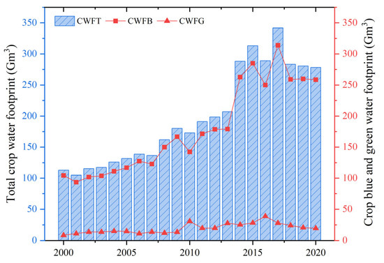 Yearly crop water footprint of Xinjiang (2000–2020). The blue bar representing (CWFT) indicates the total crop water footprint, with the scale on the left Y-axis. The red square line representing (CWFB) and the red triangular line representing (CWFG) indicate the crop blue water footprint and the crop green water footprint, respectively, with the scale on the right Y-axis. The units are Gm3.