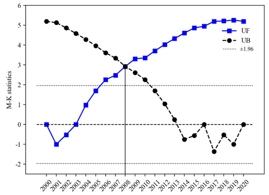 A positive UF value in the test results indicates an upward trend in the data series, whereas a negative UF value signifies a downward trend [34]. A comparative analysis was performed at the 95% confidence level. If the UF exceeds Z = 1.96, it indicates a significant increase, whereas if it falls below Z = −1.96, it signifies a significant decrease. The intersection of UF and UB indicates a mutation in the sample sequence at that specific time [36].