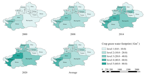 By analyzing the CWFB of different prefectures in the four nodal years across the three phases (2000, 2008, 2014, and 2020), as well as the average annual CWFB for each prefecture from 2000 to 2020, we observed significant prefectural variations in CWFB growth (Figure 6). In 2000, CWFB in most prefectures was at level 1, with only Aksu, Kashgar, and Hotan exhibiting CWFB greater than 10 Gm3. Among these, Aksu had the largest CWFB in level 3, at 29.31 Gm3.