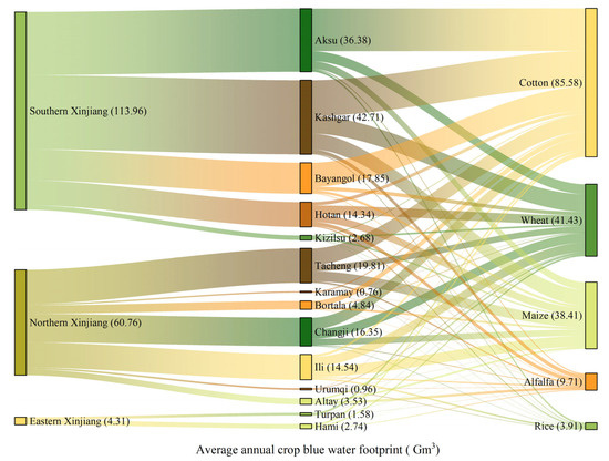 Annual average CWFB for the three major regions, fourteen prefectures, and major crops in Xinjiang from 2000 to 2020. Values in parentheses represent the corresponding annual average crop blue water footprint in Gm3.