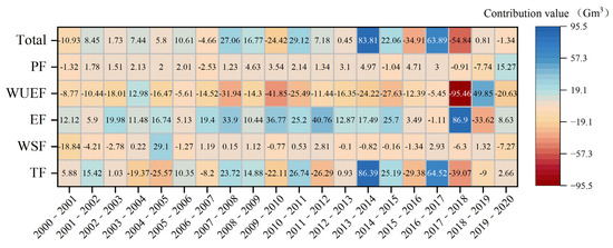Overall, the mean value of the total contribution to CWFB change from 2000 to 2020 is 7.74 Gm3, with the mean contributions of EF, TF, and P being 17.91 Gm3, 4.94 Gm3, and 1.99 Gm3, respectively. These three drivers played a positive role in driving CWFB (Figure 9). The mean contributions of WUEF and WSF were −16.91 Gm3 and −0.22 Gm3, respectively, indicating that both acted as reverse drivers for CWFB. The contributions of EF and WUEF accounted for 42.67% and 40.29% of the total, respectively, suggesting that one of these two drivers was the primary driver of CWFB change. TF and P were secondary drivers, while the inhibitory effect of WSF was negligible.
