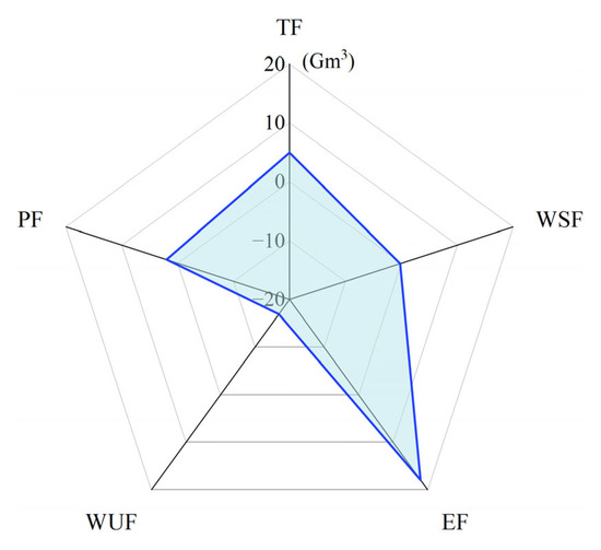 Contributions of the five drivers of CWFB from 2000 to 2020. Total indicates the amount of change in CWFB, PF indicates the amount of change in CWFB due to changes in the population effect, WUEF indicates the amount of change in CWFB due to changes in the water use efficiency effect, EF indicates the amount of change in CWFB due to changes in the economic effect, WSF indicates the amount of change in CWFB due to changes in the water use structure effect, and TF indicates the amount of change in CWFB due to changes in technology effect. WSF denotes the change in CWFB caused by the change in water use structure effect, and TF denotes the change in CWFB caused by the change in technology effect.