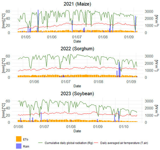 The climatic conditions for each cropping season (from sowing to harvest) were determined by following the daily average values of four significant meteorological variables: the air temperature, global radiation, reference evapotranspiration (ETo) and rainfall (R) (Figure 1). In the 2021 cropping season, the mean air temperature ranged between 9.0 and 28.0 °C; in 2022, it was between 17.0 and 30.0 °C; and in 2023, it was between 16.2 and 29.9 °C. The average cumulative daily global radiation (Rg) recorded was 2600 W·m−2 in 2021, 2192 W·m−2 in 2022 and 2229 W·m−2 in 2023. The precipitation (R) during the cropping season totaled 390 mm in 2021, 115 mm in 2022 and 158 mm in 2023. Additionally, the cumulative reference evapotranspiration (ETo) for the same periods reached 726 mm in 2021, 642 mm in 2022 and 660 mm in 2023. The drought intensity was characterized by assessing the drought indicator calculated over the cropping season as cumulative ETo/cumulative R and comparing it with the same ratio calculated over the period of April to September from 1991 to 2023. Based on this assessment, the years 2021 (2.37) and 2023 (3.84) were categorized as “average”, while 2022 (5.14) was categorized as “dry”.