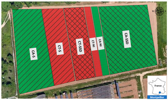 This study was conducted in Southern France, in Montpellier, at the INRAE experimental platform (43.647° N, 3.871° E) over three years (2021–2023). Specific plots were allocated for the transition from 20 years of conventional homogeneous tillage, primarily for maize production, to conservation agriculture. The adoption began in autumn 2020 by implementing soil conservation practices with, simultaneously, (i) no tillage, (ii) direct seeded winter cover crops and (iii) diversified crop rotation. The soil was classified as a Fluvisol [62] of colluvio-alluvial origin, with a texture comprising 43% silt, 36% sand and 21% clay and displaying few spatial heterogeneities [63]. The pH was alkaline at approximately 8.5. The organic matter content for the 0–20 cm soil layer was 1.6%. The total available water capacity was 150 mm per 100 cm soil depth, determined using a soil water retention curve obtained with pressure chambers.