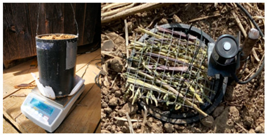 In 2021, two mini-lysimeters with undisturbed soil were placed along the crop inter-row in the central area of each of the six treatments (Figure 3). To simulate the conditions of CA with mulch at the soil surface, cover crop residues (equivalent to 3 t·ha−1 in 2021 and 6 t·ha−1 in 2022 and 2023) were laid directly onto the surface of each mini-lysimeter. In 2022 and 2023, further improvements were made to this device. Net global radiation probes (pyranometers Skye, Campbell Scientific SP1110) were placed on the soil surface of each mini-lysimeter (Figure 4). These pyranometers were used to better understand soil evaporation by measuring the net radiation arriving at the soil surface. The pyranometers were connected to the same data logger used for the soil temperature measurements, recording data every 20 min. To prevent the loss of surface mulch and its impact on soil evaporation, plant residues equivalent to the total biomass of the winter crop (6 t·ha−1 annually) were placed in litterbags. These litterbags were positioned on the surface of each mini-lysimeter (Figure 3 and Figure 4).