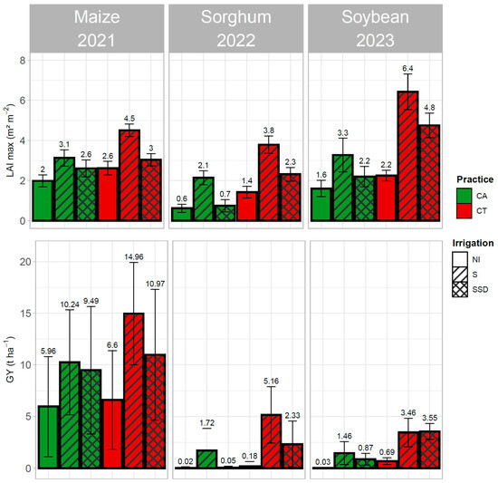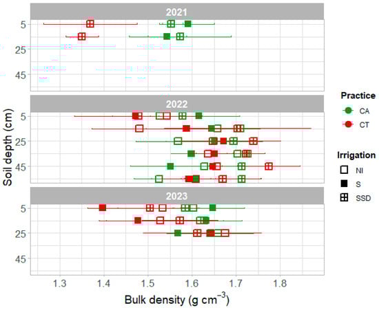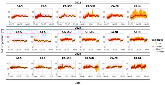 In 2021 (maize), ten irrigation applications were performed, with measured volumes of 210 mm for CA-S, 240 mm for CT-S and 250 mm for both the CA-SSD and CT-SSD treatments. In 2022 (sorghum), eight applications were performed, with CA-S receiving 240 mm, CA-SSD receiving 260 mm and both CT-S and CT-SSD receiving 260 mm. In 2023 (soybean), eight applications were performed, with CA-S receiving 300 mm, while CA-SSD, CT-S and CT-SSD all received 270 mm. As can be seen, some variability in the irrigation volumes was observed in sprinkler irrigation, primarily due to wind-induced drift losses during irrigation. However, soil moisture monitoring at different depths confirmed that the soil moisture levels remained consistently above the permanent wilting point throughout the growing season, ensuring adequate water availability for crop development.