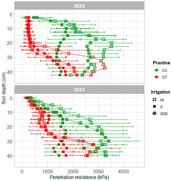In 2021, the soil penetration resistance was evaluated using the Eijkelkamp IB model hand penetrometer (Giesbeek, The Netherlands) [64]. Subsequently, for 2022 and 2023, Field Scout’s shaft-mounted digital probe SC900 (FieldScout) (Spectrum Technologies, Inc., Aurora, IL, USA) was used, aiming to enhance the measurement convenience and data accuracy. Random measurements with at least 10 repetitions per treatment were realized. Using a half-inch-diameter cone, the penetrometer provided continuous readings up to a depth of 40 cm for every 2.5 cm depth.