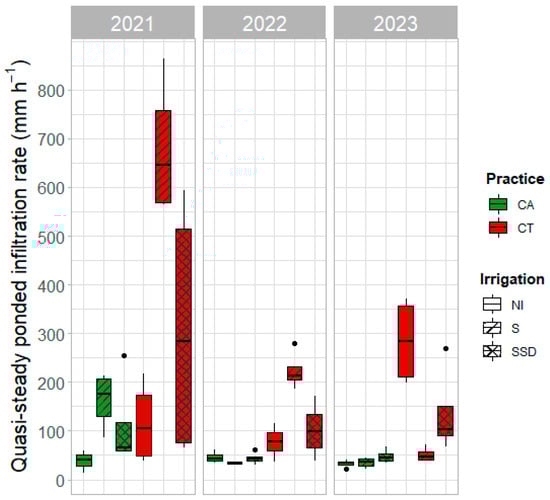Soil infiltration was characterized by measuring the quasi-steady ponded infiltration rate using the double Müntz ring method. This approach implies vertically infiltrating a uniform layer of water into the soil for a defined period until a constant infiltration rate is attained [65]. An automated device, based on the Müntz method developed by Garnier and Elamri [66], was employed to facilitate the systematic recording of infiltration data. Automation consisted of a controlled filling process for both the measurement and guard rings, ensuring a constant uniform water height during infiltration events. The system included sensors for precise water level management in the rings, enabling the filling of a specific ring from a designated reservoir. Throughout the measurement period, a Diver® probe, positioned at the base of the reservoir supplying the central cylinder, autonomously acquired the infiltrated water heights. In the central zone of each treatment, after sowing, four infiltration device replicates were used, spaced at 5 m intervals. The experiment spanned over two hours to ensure a steady-state infiltration rate. Following the approach defined by Vinatier et al. [67], the quasi-steady ponded infiltration rate was determined as the change in the infiltrated water volume per unit area of the measurement cylinder during the final 30 min of steady-state conditions.