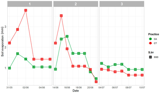 where denotes the amount of rainfall or irrigation (mm), represents the mass variation converted into water loss in mm3 (e.g., grams of water associated with each cubic millimeter) and represents the evaporating surface area of the lysimeter (mm2). As indicated by Trambouze [69], this methodology has a limitation, because, when a water input occurs through rainfall or irrigation, the mini-lysimeter gains weight, making it difficult to differentiate the actual amount of water evaporated. Consequently, in our experiment, only the data collected during periods without rainfall or irrigation were considered.