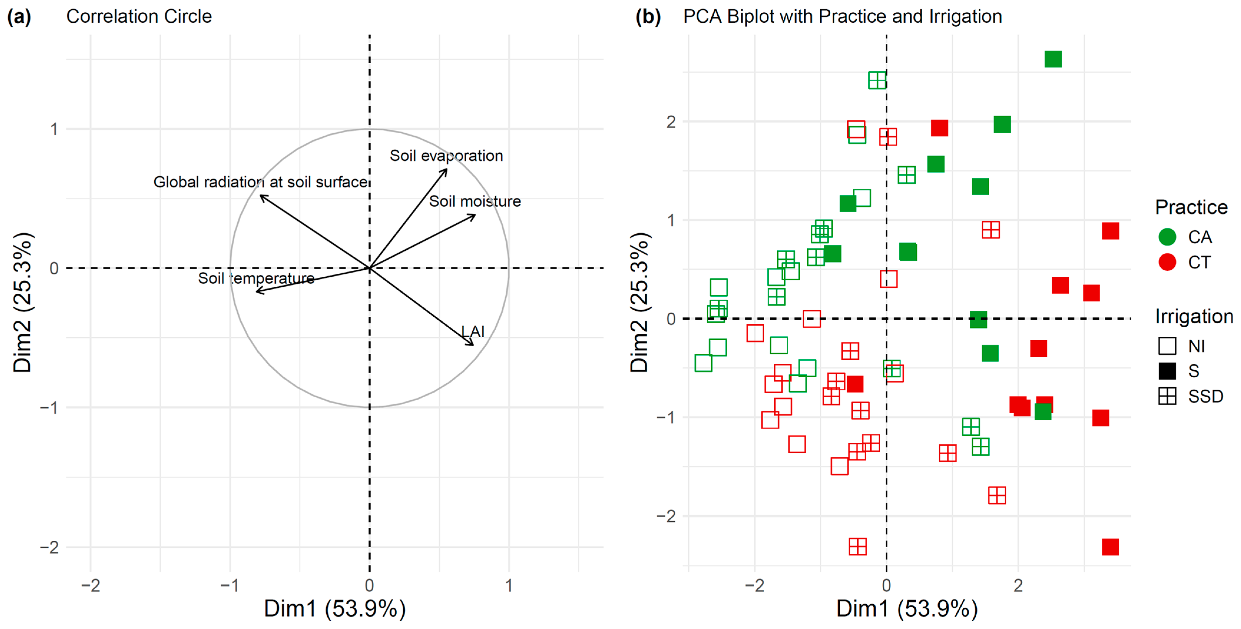 Maize (Zea mays L., RAGT IXABEL), sorghum (Sorghum bicolor L., HUGGO) and soybean (Glycine max L., RGT SPEEDA) crops were cultivated under either conventional tillage (CT) or conservation agriculture (CA). In CA plots, (1) zero tillage, (2) winter cover cropping (direct seeded) with residue-covered soil and (3) crop rotation were simultaneously implemented. CT plots involved conventional tillage and bare soil in winter. Both CT and CA were followed under sprinkler (S) irrigation, subsurface drip (SSD) irrigation or no irrigation (NI), leading to an experimental agronomic set-up in large strips with six treatments in total, covering an area of 1.5 ha (Figure 2). SSD irrigation was installed in 2019 at a depth of 35 cm, which represented a constraint regarding the layout of the treatments from the start of the experiment in 2021. Consequently, it was not possible to randomize the treatments as shown Figure 2: SSD irrigation covered the eastern part of the plot, while S irrigation covered the western part. Previous studies, however, indicated few spatial heterogeneities within the top 30 cm of soil [63], supporting the suitability of this layout.
