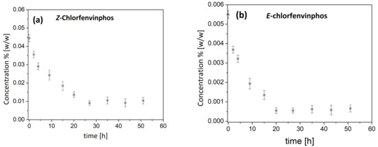 (a,b). Course of the degradation of (a) Z-chlorfenvinphos and (b) E-chlorfenvinphos in the laboratory scale fluidized bed reactor. The results obtained are presented as a mean value and ± SD from three independent experiments.