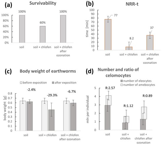 Aside from the chemical changes, the main aspects of the conducted investigations were the toxicity assays based on the utilization of earthworms. As presented in Figure 3a–d, chlorfenvinphos toxicity was verified by acute and chronic toxicity tests. The tests included a survivability test, NRR-t assay, body weight measurement, and the number and ratio of celomocytes.