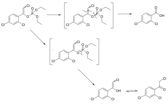 Other transformations of chlorfenvinphos can occur due to hydrolysis. This can be catalyzed by H+, Ca2+, Na+, and K+ from the mono-ionic kaolinite and bentonite present in clays. However, it was indicated that the chlorfenvinphos hydrolysis process is less important compared to degradation mediated by microorganisms (National Registration Authority, 2000). This observation is a result of experiments conducted under natural conditions in loamy sands (pH 7.2; 1.6% of organic carbon) and the fertile layer of soil (pH 6.5; 27.8% of organic carbon) [10].