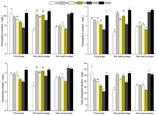 Figure 1. Effects of abscisic acid on the photosynthetic pigment content of rice under salt stress. CK (control treatment), S1 ((water, spraying S-ABA in 3-leaf/1-heart stage), S2 ((water, spraying S-ABA in 3-leaf/1-heart stage and twice in break stage), NA (0.4%NaCl), NAS1 (0.4%NaCl, spraying S-ABA in 3-leaf/1-heart stage), NAS2 (0.4%NaCl, spraying S-ABA in 3-leaf/1-heart stage and twice in break stage). Values are the mean ± SD of three replicate samples. Different letters in the data column indicate significant differences (p < 0.05) according to Duncan’s test.