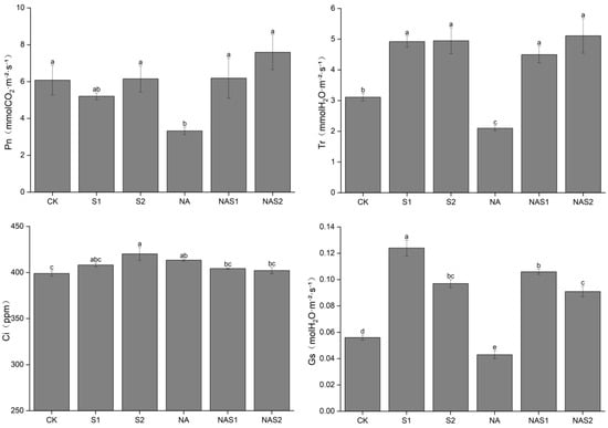 Figure 2. Effects of abscisic acid on the net photosynthetic rate (Pn), transpiration rate (Tr), stomatal conductance (Gs), and intercellular CO2 concentration (Ci) of rice under salt stress in the filling stage. CK (control treatment), S1 ((water, spraying S-ABA in 3-leaf/1-heart stage), S2 ((water, spraying S-ABA in 3-leaf/1-heart stage and twice in break stage), NA (0.4%NaCl), NAS1 (0.4%NaCl, spraying S-ABA in 3-leaf/1-heart stage), NAS2 (0.4%NaCl, spraying S-ABA in 3-leaf/1-heart stage and twice in break stage). Values are the mean ± SD of three replicate samples. Different letters in the data column indicate significant differences (p < 0.05) according to Duncan’s test.