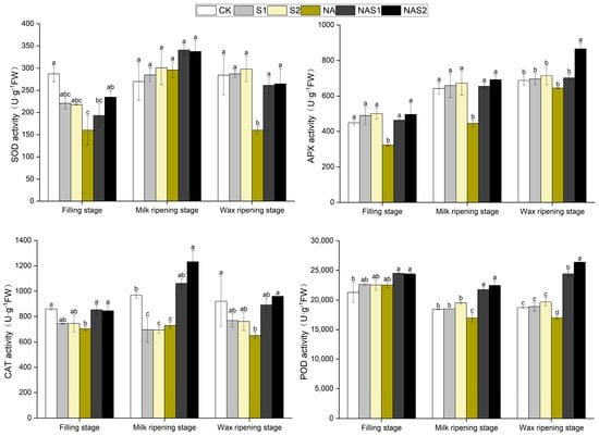 As shown in Figure 3, it becomes manifest that the activities of antioxidant oxidases in the leaves of rice plants, when subjected to salt stress and S-ABA, display dissimilarities. Compared with CK, the SOD, APX, CAT, and POD activities were decreased by 43.73%, 6.25%, 9.30%, and 29.43%, respectively, under salt treatment (NA). Under non-salt stress, S-ABA (S1, S2) treatment induced increases in APX and POD in the filling stage, milk ripening stage, and wax ripening stage, and SOD in the milk ripening stage and wax ripening stage, as compared with CK, but these effects were not significant. In contrast, CAT enzyme activity in the milk ripening stage was significantly decreased by 28.12% and 28.30%, respectively. Under salt stress, the SOD, APX, CAT, and POD activities under S-ABA (NAS1, NAS2) treatment were increased compared with those under NA. The NAS2 treatment produced the greatest increases compared with NA. The SOD activity of NAS2 treatment increased by 46.63%, 14.01%, and 65.28% in the filling, milk, and wax stages, respectively, the APX activity increased by 53.15%, 55.51%, and 34.28%, respectively, and the POD activity increased by 8.33%, 32.46%, and 55.42%, respectively. The CAT activity increased by 20.06%, 69.13%, and 47.66%, respectively.