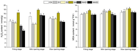 As shown in Figure 4, under salt stress, the H2O2 and MDA contents in rice leaves in the filling stage, milk ripening stage, and wax ripening stage increased sharply, by 32.09%, 20.83%, and 18.76%, and 12.38%, 9.98%, and 11.27%, respectively. Under non-salt stress, S-ABA (S1, S2) treatment decreased the H2O2 content in rice leaves; this difference was not significant. In contrast, the content of MDA underwent an upward trend. Specifically, under the S2 treatment during the filling stage, milk ripening stage, and wax ripening stage, the increases achieved statistical significance. The augmentations were, respectively, 3.86% in the filling stage, 4.87% in the milk ripening stage, and 8.69% in the wax ripening stage. Under salt stress, both the S-ABA (NAS1 and NAS2) treatments significantly reduced the H2O2 content of rice leaves by 52.18%, 14.89%, and 6.05%, and significantly reduced MDA content by 11.66%, 12.49%, and 10.07% in the filling stage, milk ripening stage, and wax ripening stage, respectively. The NAS2 treatment exhibited the greatest effect.