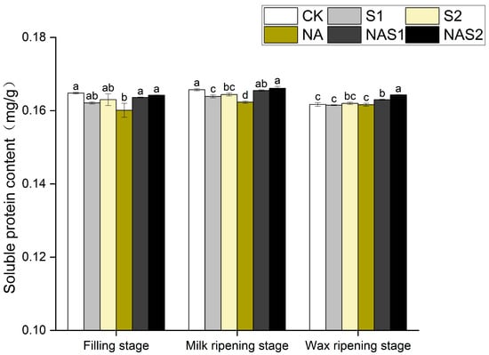Plants’ response mechanisms to stress involve an upsurge in the generation of osmoregulatory substances. When confronted with stress, plants tend to boost the production of osmoregulatory substances as a means of adaptation. As shown in Figure 5, salt stress reduced the soluble protein content in rice leaves in the filling stage, milk ripening stage, and wax ripening stage, by 2.90%, 2.03%, and 0.10%, respectively. Under non-salt stress, S-ABA (S1, S2) treatment decreased the soluble protein content of rice in the filling stage and milk ripening stage, with S1 and S2 reaching statistical significance in the milk ripening stage, declining by 1.08% and 0.78%, respectively. Under salt stress, S-ABA (NAS1, NAS2) treatment significantly promoted the synthesis of soluble protein in the filling stage, milk ripening stage, and wax ripening stage, with increases of 2.21% and 2.60%, 1.98% and 2.35%, and 0.87% and 1.72%, respectively. NAS2 produced the largest increases.