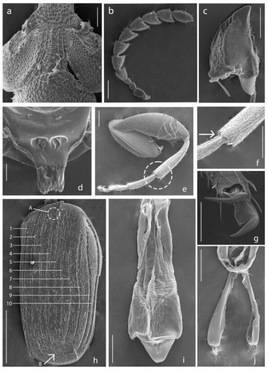 Acanthoscelides atrocephalus. (a) Head, dorsal view; (b) Antenna; (c) Mandible; (d) Scutellum; (e) Hind leg, apex of metatibia is indicated by dashed line; (f) Apex of metatibia, mucro is indicated by the arrow; (g) Claws; (h) Elytron, striae are indicated by numbers, small tooth is indicated by the letter A, striae not reaching the apical margin are indicated by the letter B; (i) Median lobe of aedeagus, dorsal view; (j) Lateral lobes of aedeagus, dorsal view. Scale bars 5, 7 = 100 μm; 6, 9, 10 = 200 μm; 8, 11, 13 = 50 μm; 12 = 500 μm; 14 = 10 μm.