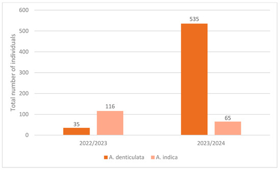 Total number of individuals of Acanthoscelides atrocephalus to Aeschynomene denticulata and Aeschynomene indica, collected between 2022/2023 and 2023/2024.
