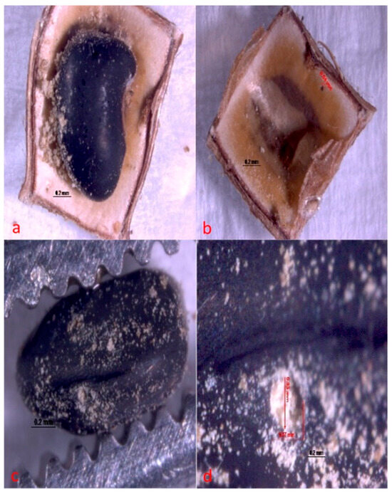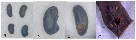 Hole pattern of angiquinho seed (Aeschynomene denticulata and Aeschynomene indica) made for the adult Acanthoscelides atrocephalus (Coleoptera: Chrysomelidae, Bruchinae) to emerge. (a) comparison between whole and drilled seeds; (b,c) close-up view of drilled seeds after weevil emergence; (d) hole on seed and through fruit, with seed inside.