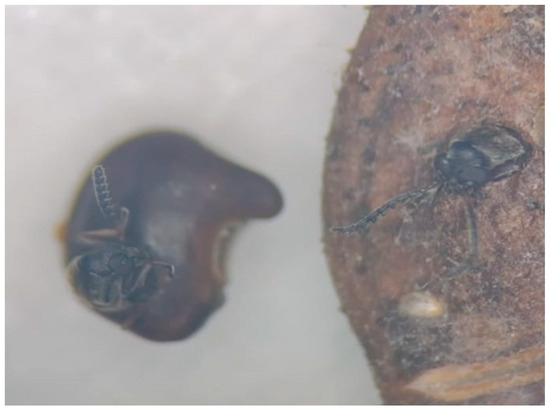Beetles are important possible biological control agents for weeds, for when their larvae feed on seeds, they cause damage to the embryo and neutralize it [37]. In other words, seeds are important structures for the development of plants once they ensure dispersion and permanence in the environment. Therefore, consumption by predation directly affects their germination and dispersion [38,39,40,41]. Furthermore, if weed control consists of inhibiting growth and/or reducing the number of individuals per area below the economic losses for the crop [11], then reducing seed banks is convenient for integrating weed management (IMPD).