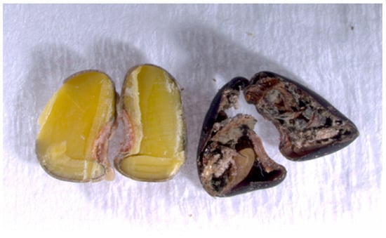 Inside comparison of an angiquinho whole seed and a drilled seed (Aeschynomene denticulata and Aeschynomene indica) by Acanthoscelides atrocephalus (Coleoptera: Chrysomelidae, Bruchinae) with remains of rotting waste.