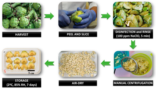 The rest, attending to the cultivar and the flower head order, were peeled until obtaining the artichoke hearts, which were cut into slices. Then, they were disinfected using a solution of water and food-grade bleach of sodium hypochlorite (NaClO) at a concentration of 100 ppm where they stayed for 5 min to remove any possible surface contaminants. After disinfection, the artichoke hearts were carefully rinsed with abundant water, centrifuged using a manual centrifuge to remove excess moisture, and air dried. Once dry, they were placed in polyethylene plastic trays. In this way, 10 trays of each cultivar and flower head order were filled, with 12 slices of artichoke hearts each, making a total of 90 trays. Finally, the trays were stored under controlled conditions at a temperature of 2 °C and a relative humidity of 85% for a period of 7 days (Figure 1).