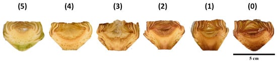 An evaluation of general acceptability of different artichoke head orders (main, secondary, and tertiary heads) of ‘Lorca’, ‘Tupac’, and ‘Green Queen’ cultivars was performed in triplicate by a trained panel of 10 judges (5 males and 5 females) from the Department of Agri-Food Technology of Miguel Hernández University (Orihuela, Alicante, Spain) on day 0, day 1, and day 3 of storage at 2 °C. The overall acceptability assessment was scored using a 6-point hedonic scale with increments of 0.5, based on a visual scale made with photos taken previously for this trial (Figure 2). The description of each sensory score is defined in Table 1. A score of 3 or less indicates the end of its shelf life, since the visual appearance does not meet the quality criteria. Results were expressed as mean ± SE.