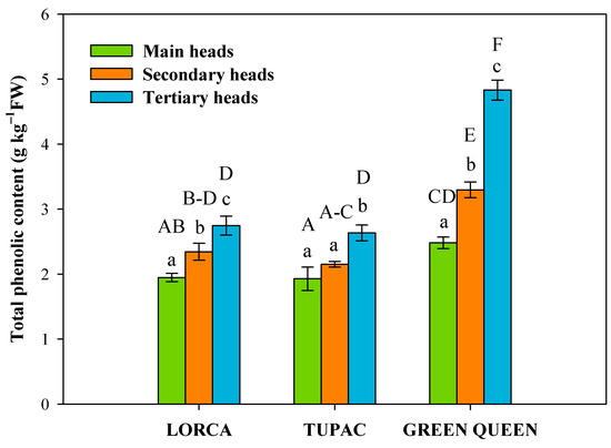 Total phenolic content (g kg−1 FW) for different artichoke head orders (main, secondary, and tertiary heads) of ‘Lorca’, ‘Tupac’, and ‘Green Queen’ cultivars at harvest. Different lowercase letters show significant differences between flower head orders of each cultivar individually, according to Duncan test at p ≤ 0.05. Different capital letters show significant differences between the interaction of flower head orders and all cultivars, according to Duncan test at p ≤ 0.05. Data are the mean ± SE.