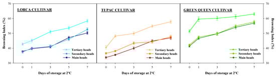 Browning evolution (% browning index) for the interaction of cultivars (‘Lorca’, ‘Tupac’, and ‘Green Queen’), artichoke head order (main, secondary, and tertiary heads), and day of storage interrelated.