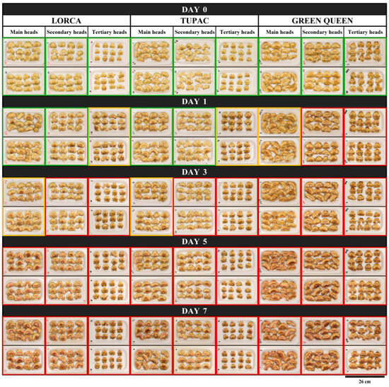 Images of the browning evolution for different artichoke head orders (main, secondary, and tertiary heads) of ‘Lorca’, ‘Tupac’, and ‘Green Queen’ cultivars at harvest and during 7 days of storage at 2 °C. Different frame colors illustrate relevant changes in the browning evolution between cultivars and flower head orders at harvest and during 7 days of storage at 2 °C.