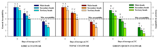 In contrast, the ‘Green Queen’ cultivar performed poorly across all head orders. Its general acceptability scores for secondary and tertiary heads fell below the minimum threshold as early as day 1. In this sense, none of the samples exceeded the minimum of acceptability on day 3, since no antioxidant was added to delay the degradation process. This was due to the fact that the field of study was the intrinsic aptitude of each sample as a fresh-cut product. Within these outcomes, the ‘Green Queen’ cultivar obtained the worst results—well below the acceptable quality threshold—indicating significant deterioration.