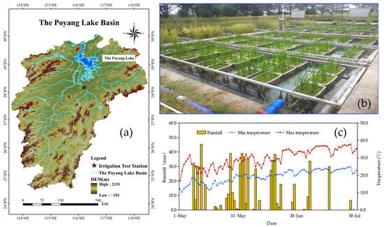 The rice potting trial was conducted from May to August 2022 at the Jiangxi Irrigation Experiment Central Station in Nanchang County, Jiangxi Province (located at 116°00′ E, 28°26′ N), which is a typical humid monsoon climate zone in the subtropics (Figure 1). Over the preceding 44 years (1978–2021), the research region experienced average annual conditions, including a temperature of 17.6 °C, 1506 mm of rainfall, 1720.8 sunshine hours, and 915.0 mm of pan evaporation. Detailed weather data, including maximum and minimum temperatures and rainfall, were documented by the Research Base of the Jiangxi Provincial Irrigation Experiment Central Station during the study period (Figure 1). Rainfall in the region is seasonally distributed, with approximately 66% occurring between March and July. The average light duration during the potting experiment was 3.58 h, and the relative humidity was 87.5%. The soil used in our study was alluvial yellow soil, sourced from the top 20 cm of a paddy field and exhibiting the following properties: 13.9 g kg−1 of organic matter, 1.2 mg kg−1 of total nitrogen, 0.50 mg kg−1 of total phosphorus, 5.8 mg kg−1 of total potassium, 11.60 mg kg−1 of effective phosphorus, 118.0 mg kg−1 of available potassium, a pH level of 5.2, and a soil density of 1.2 g cm−3.