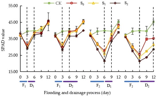 The effects of different sediment content, flooding time, and drainage time on rice SPAD value exhibited notable differences (Figure 3). After the beginning of the experiment, the SPAD value of the leaves exhibited a gradual increase in the CK treatment, whereas a decreasing trend was observed in the other treatments. The greatest decline in SPAD value was observed in S2F2D1, with a reduction of 41.57% on the sixth day following continuous submergence, which was only 53.88% of that of the control treatment. The SPAD values of all treatments that were subjected to complete flooding and without drainage were found to be significantly lower (p < 0.05) than those of the CK treatment (p < 0.05). When there was prolonged flooding (six days), SPAD values were significantly lower in the S2 treatment than in the S0 and S1 treatments, indicating that the high sediment content disrupted the physiological activities of rice and further reduced photosynthesis.