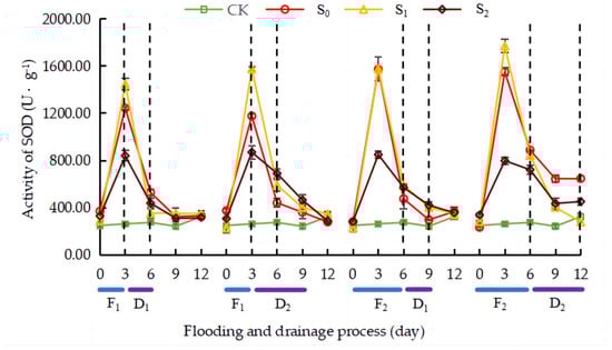 The variation of SOD activity in CK rice leaves during the heading–flowering stage was small, fluctuating around 300 U g−1 (Figure 4). From the overall trend, leaf SOD activities increased and then decreased with the flooding and drainage process, reaching the maximum value when flooding lasted for 3 days. The S1F2D2 treatment showed the greatest increase in leaf SOD activity at 3 days of flooding, which was 5.68 times higher than that of the CK treatment. Regarding the sediment content, the SOD activity of the S2 treatment was significantly lower than that of the S0 and S1 treatments at a certain time of flooding and drainage, indicating that the high sediment content disturbed the dynamic balance of the rice enzyme system and affected the production of SOD.