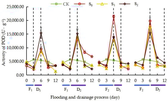 The variation in POD activity in CK rice leaves at the heading–flowering stage was minimal, exhibiting fluctuations around 5000 U g−1 (Figure 5). The overall trend in POD activity exhibited a decrease initially, followed by a sharp increase and subsequent decrease in the progression of the flooding and drainage process. The maximum value was reached on the sixth day after the commencement of the experiment (22 June). The leaf POD activity of S1F1D1 treatment decreased to the lowest value on the sixth day of drainage, which was only 39.41% of that of CK in the same period. The maximum increase in leaf POD activity was observed in the S0F2D1 treatment on the sixth day of flooding, with a value 3.09 times higher than that of the CK treatment. In terms of sediment content, higher POD activities were observed in the S0 and S1 treatments than in the S2 treatment in F1, and lower POD activities were observed in the S0 and S1 treatments than in the S2 treatment in F2 when the flooding and drainage times were constant. This suggests that POD activity is less responsive to sediment content and more sensitive to the duration of flooding.