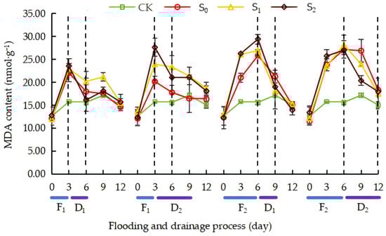 The MDA content of the CK in this experiment fluctuates around 15 µmol g−1 (Figure 6). The general trend indicates that the MDA content initially increased and then declined with the progression of the flooding and drainage process, reaching a maximum value after the flooding (without drainage). The greatest increase in MDA content was observed in the leaves of the S2F2D1 treatment, which occurred during the sixth day of flooding. When the sediment content was held constant, the MDA content of the leaves increased by 65.4% in the F1 treatment after the flooding compared to the CK. Following the conclusion of the flooding period in the F2 treatment, the MDA content exhibited a 91.1% increase in comparison to the CK. When the receding time was held constant, the MDA content of the S2 treatment was observed to be higher than that of the S0 and S1 treatments. The leaf MDA content at the conclusion of the six-day flooding in treatment D1 was higher than that observed in treatment D2. The MDA content of the S1F1D2 treatment was the highest at the conclusion of the experiment, exhibiting a ratio of 1.2 times that of CK.
