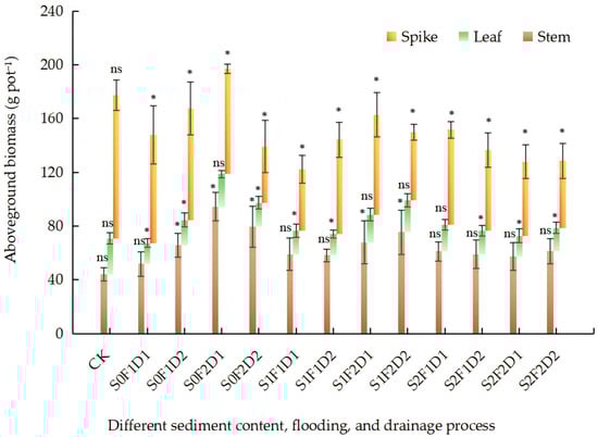 The aboveground biomass exhibited a decline in all treatments except the S0F2D1 treatment following the implementation of distinct sediment content, flooding, and drainage process during the early rice heading–flowering stage (Figure 7). The S1F1D1 treatment showed the lowest total accumulation, 31.09% lower than the CK treatment. After a three-day flooding period, the total bioaccumulation for sediment content S0, S1, and S2 decreased by 11.28%, 24.89%, and 18.83%, respectively, compared to CK. After a six-day flooding period, the total accumulation for S0, S1, and S2 decreased by 5.23%, 11.95%, and 27.75%, respectively, compared to CK. This indicates that bioaccumulation is inversely proportional to flooding duration, with six-day flooding showing the greatest reduction. After the flooding and drainage process, spike and leaf biomass decreased, while stem biomass increased. The AGB increase in S0F2D1 was due to a significant stem expansion. The stem biomass of S0F2D1 and S0F2D2 increased by 114% and 80.38%, respectively, compared to CK (p < 0.05). Similarly, S1F2D1 and S1F2D2 increased by 54.13% and 71.16%, respectively. Leaf biomass in S0F1D1, S1F1D2, and S2F2D1 treatments decreased significantly by 42.67%, 40.64%, and 42.37%, respectively, compared to CK. Spike biomass, except for S0F1D1 and S0F1D2, decreased significantly compared to CK (p < 0.05). Among these, S0F2D2 exhibited the lowest spike accumulation, which was found to be significantly reduced by 60.85% in comparison to CK.