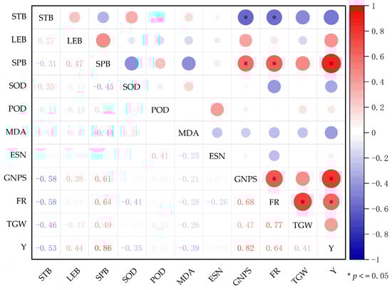 Correlation analysis of yield and various indexes of early rice after being flooded at the heading–flowering stage. STB: stem biomass; LEB: leaf biomass; SPB: spike biomass; ESN: effective spike number; GNPS: grain number per spike; FR: fruiting rate; TGW: thousand-grain weight; and Y: yield.