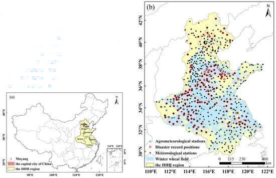Study area in China (a) and locations of agrometeorological stations, meteorological stations, and actual disaster records in the HHH region, China (b).